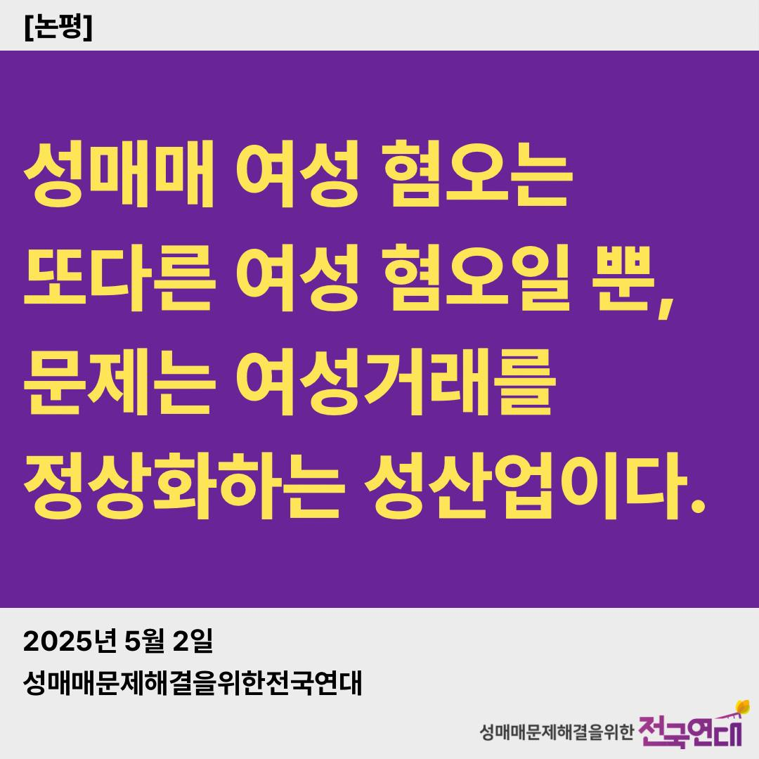 | 48 | [논평] 성매매 여성 혐오는 또다른 여성 혐오일 뿐, 문제는 여성거래를 정상화하는 성산업이다. | 관리자 | 2025-05-02 13:24:22 | 288 |
